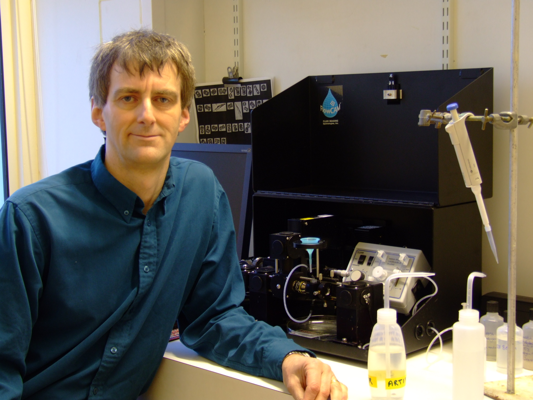 Image caption: Kevin pictured with a new FlowCam in 2009. He says ”Our version was a ‘special‘ which could measure whether the plankton were actually alive! It was used during the ocean acidification projects.”