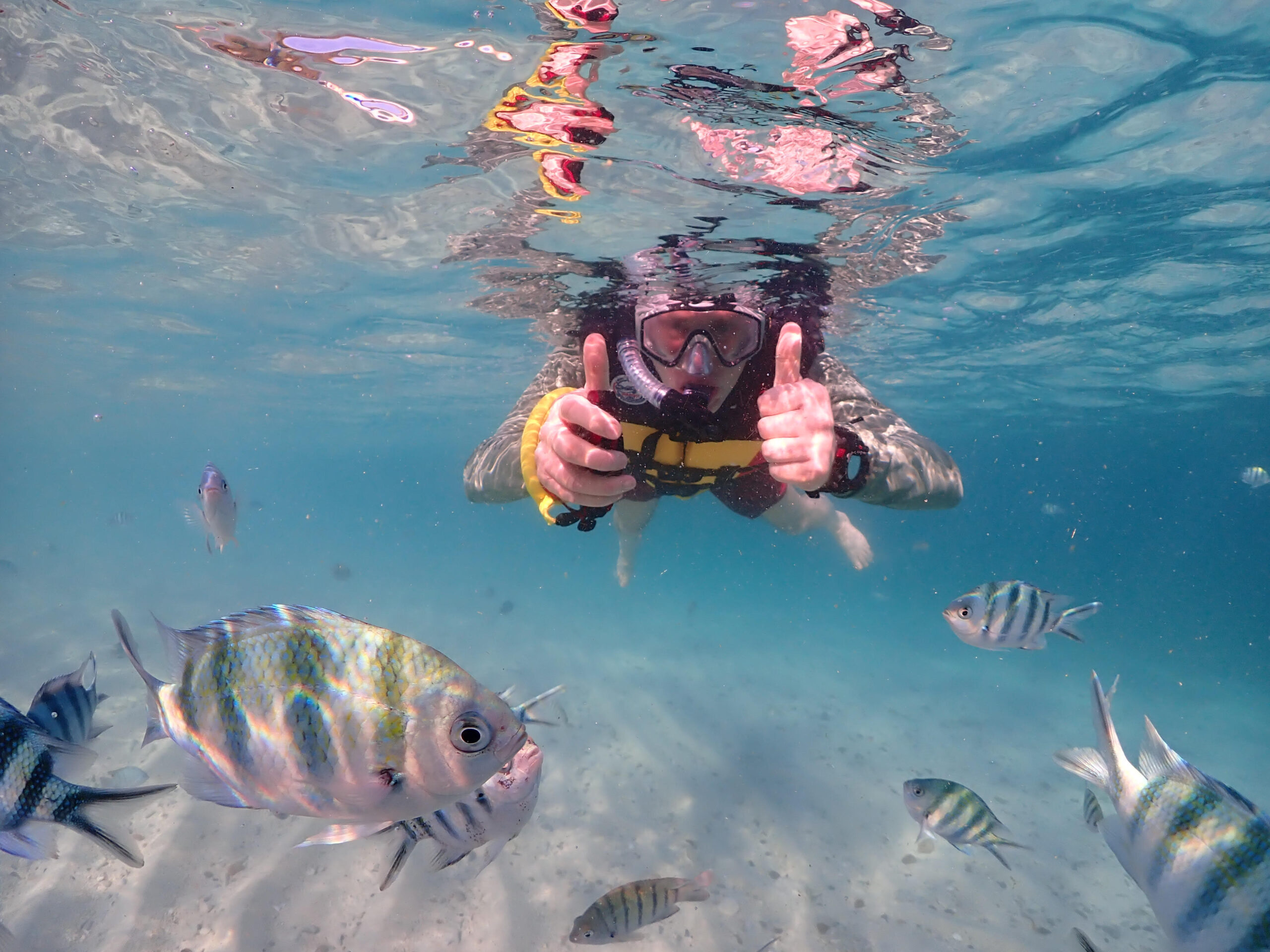 Image caption: Kevin snorkeling off Thailand (2024), nominally looking for green Noctiluca! ”Actually, we were there teaching plankton modelling and for a workshop on mixoplankton.”