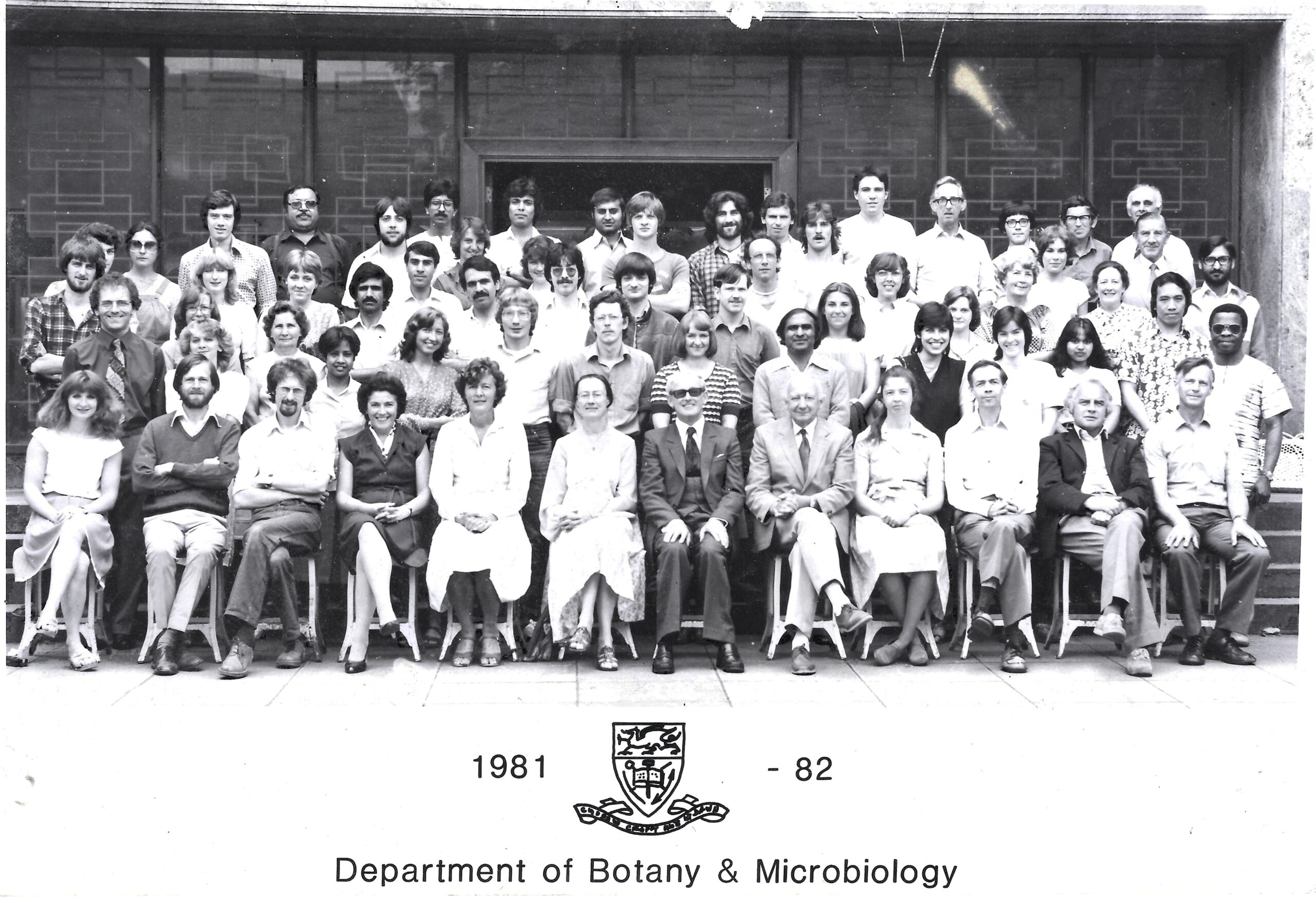 Image caption: From the end of his first PhD year, Kevin is the bearded individual upper far left. Professor Phil Syrett is front row above the number ’82‘. The lady in the front row above-right of ’1981‘ is Dr Helgi Öpik, who was the department’s electron microscopist. Helgi was of a family who escaped from Estonia in the 1940s; her father was the famous astronomer Ernst Öpik, while one of her other relatives is the former MP, Lembit Öpik. Kevin recalls, ”Everyone lived in fear of Helgi who was an authoritarian figure. She was one of my three 1st year UG tutors (yes, three – those were the days!), but over the following decades we became firm friends, and she actually had a very good sense of humour. Proof indeed to never judge a book by its cover.”