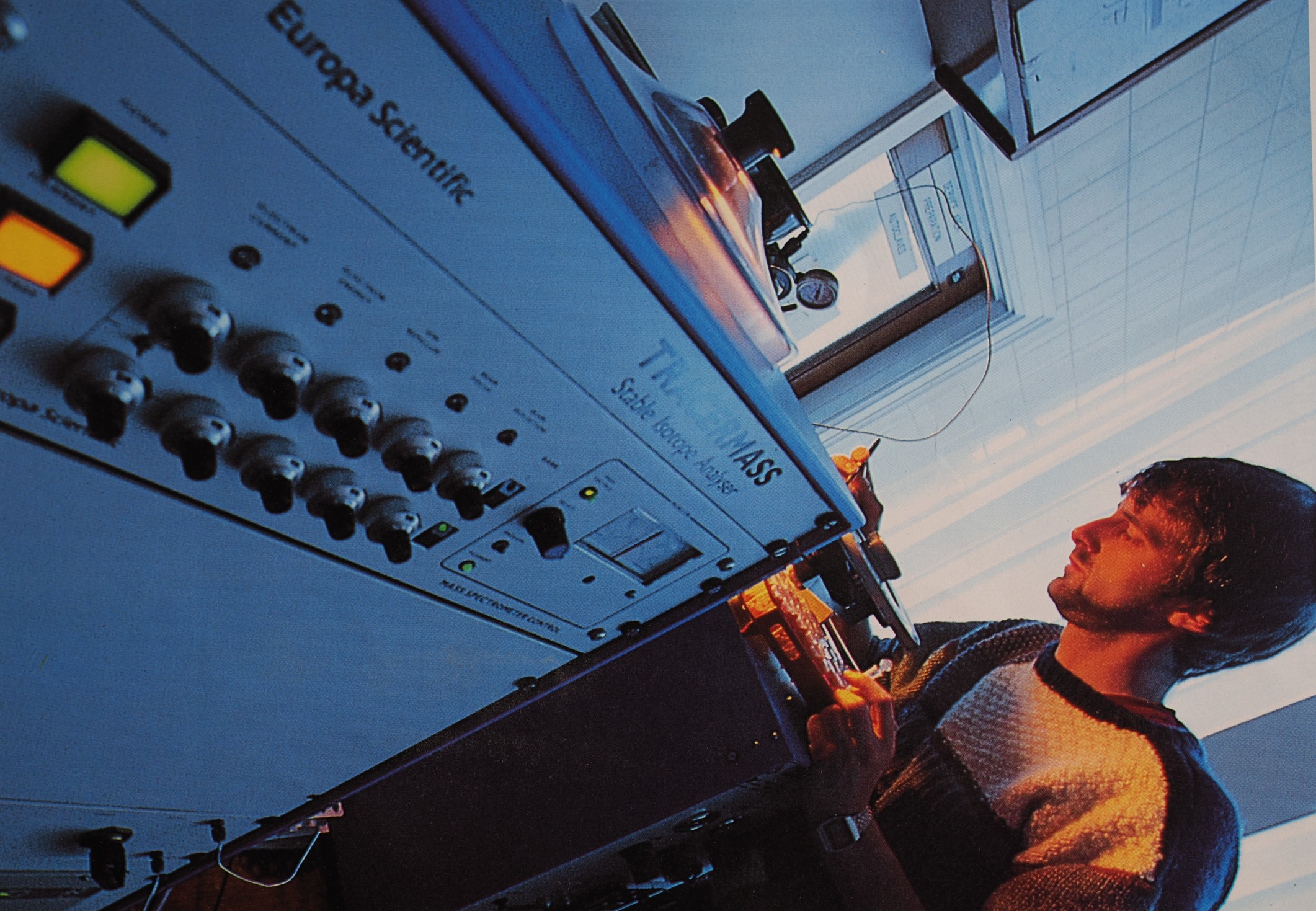 Image above: Kevin pictured in 1994 in the algal research laboratory at Swansea loading up samples for elemental and 15N analysis. “This was a publicity photograph for ‘Advances Wales’; normally you wear a lab coat, of course, otherwise I would have been analysing wool!”