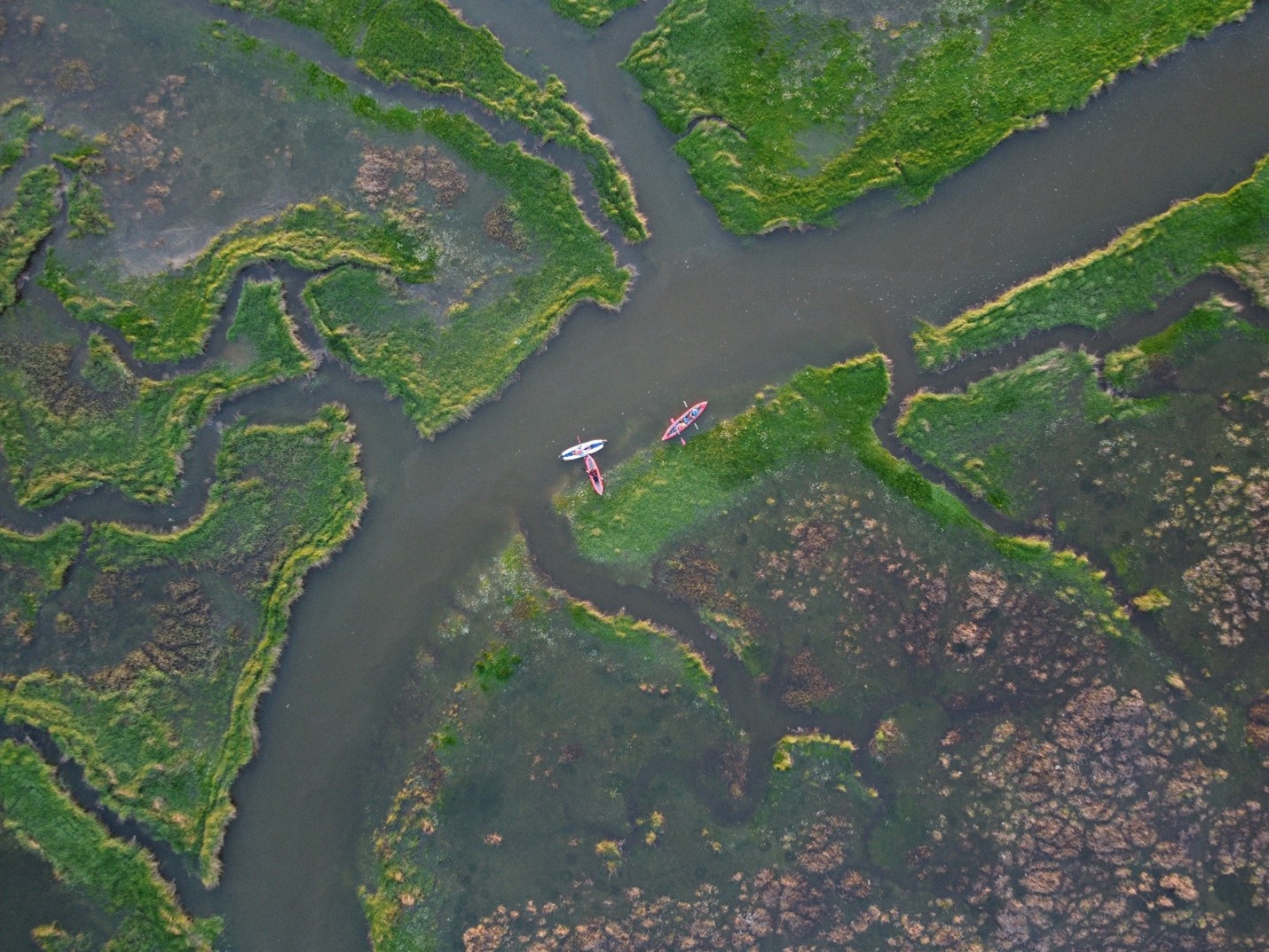 Image caption: Kayaking through the North Gower salt marshes at high tide. Kevin is in the back of the double kayak, flying the drone. He said, ”Landing the drone in your hand when seated in a drifting kayak is something of an art which is very painful if you fail and the rotor blades clip your fingers!”